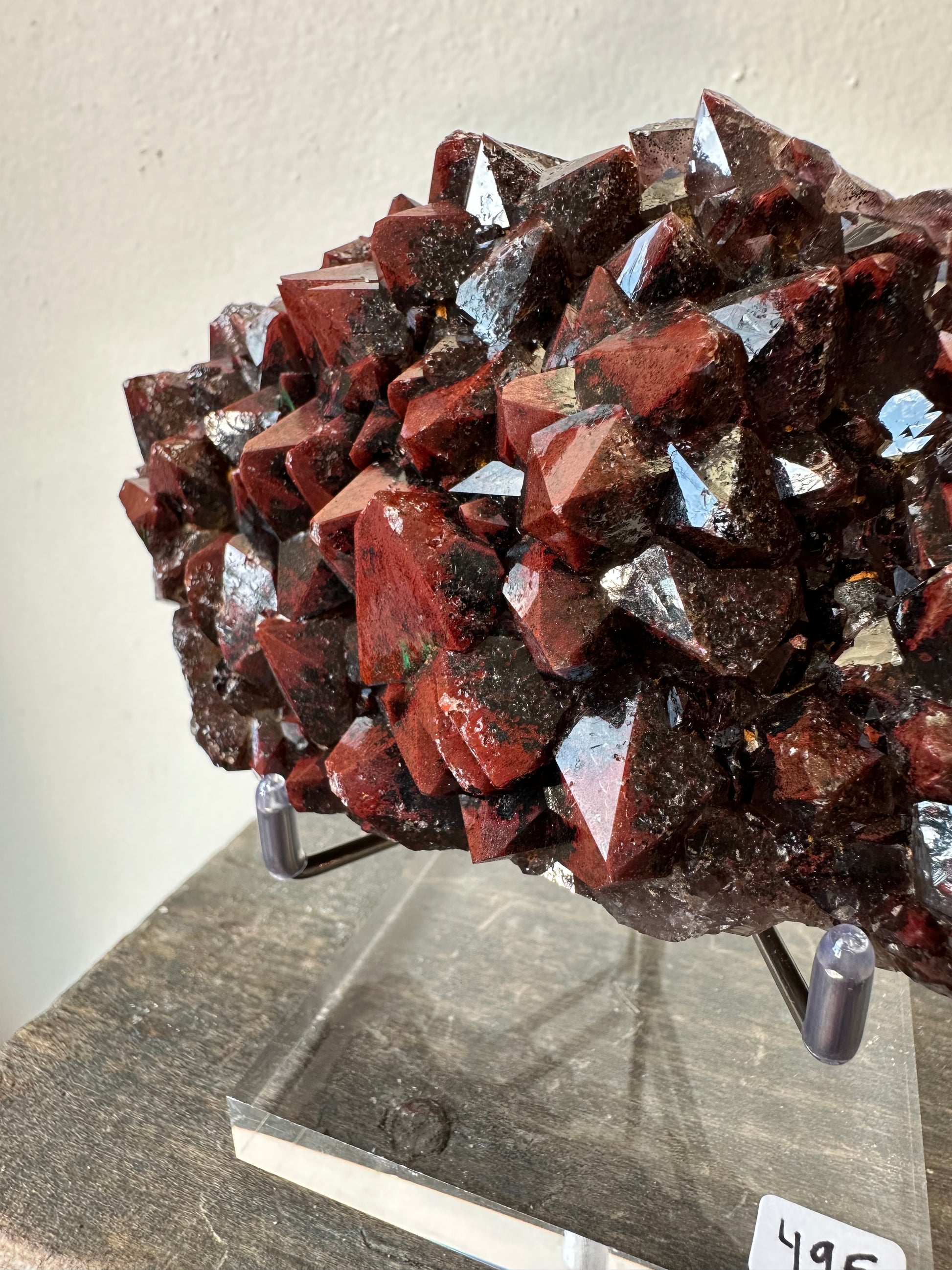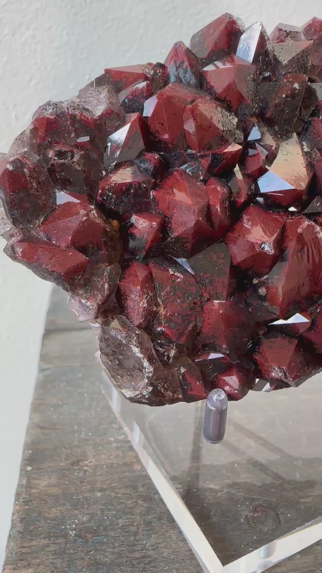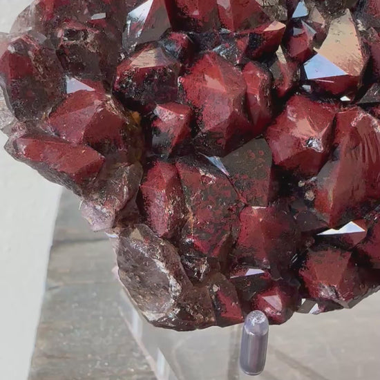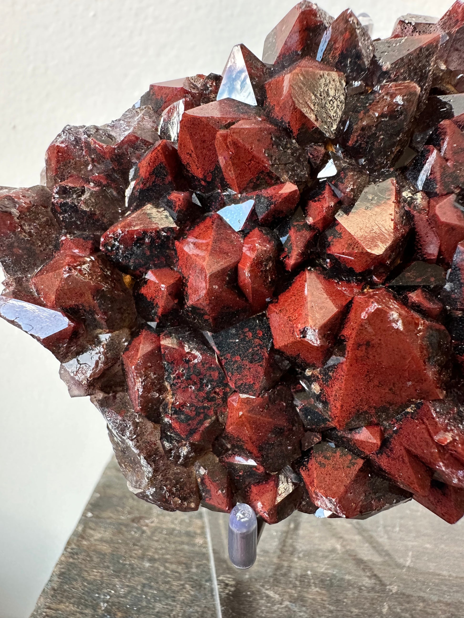 There is a layer of amethyst, then a layer of smoky amethyst, and the top layer looks black with red but is just intensely included with millions of dots of hematite.