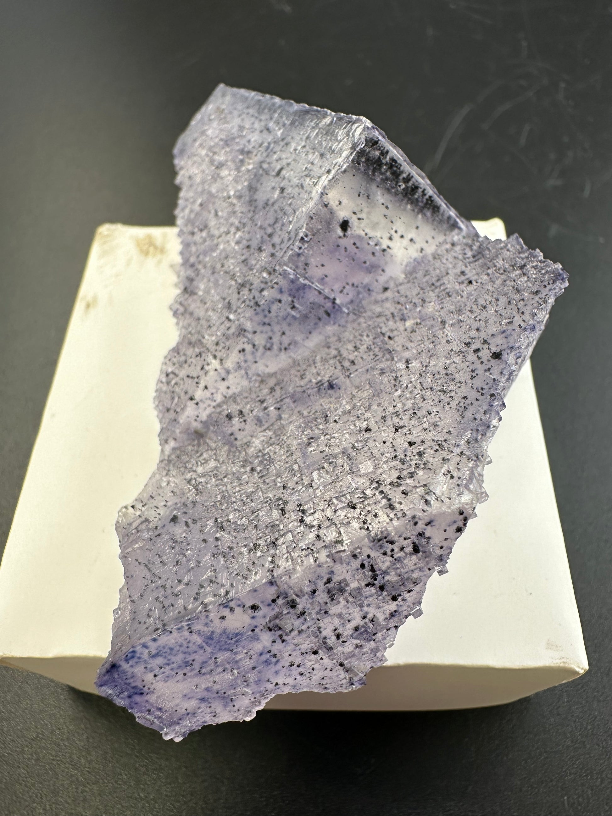 Soft lavender purple with small spots or specks that are often called “radiation burns” but are actually impurities such as pyrite or chalcopyrite embedded in the fluorite. Darker purple zoning visible on the face cube.