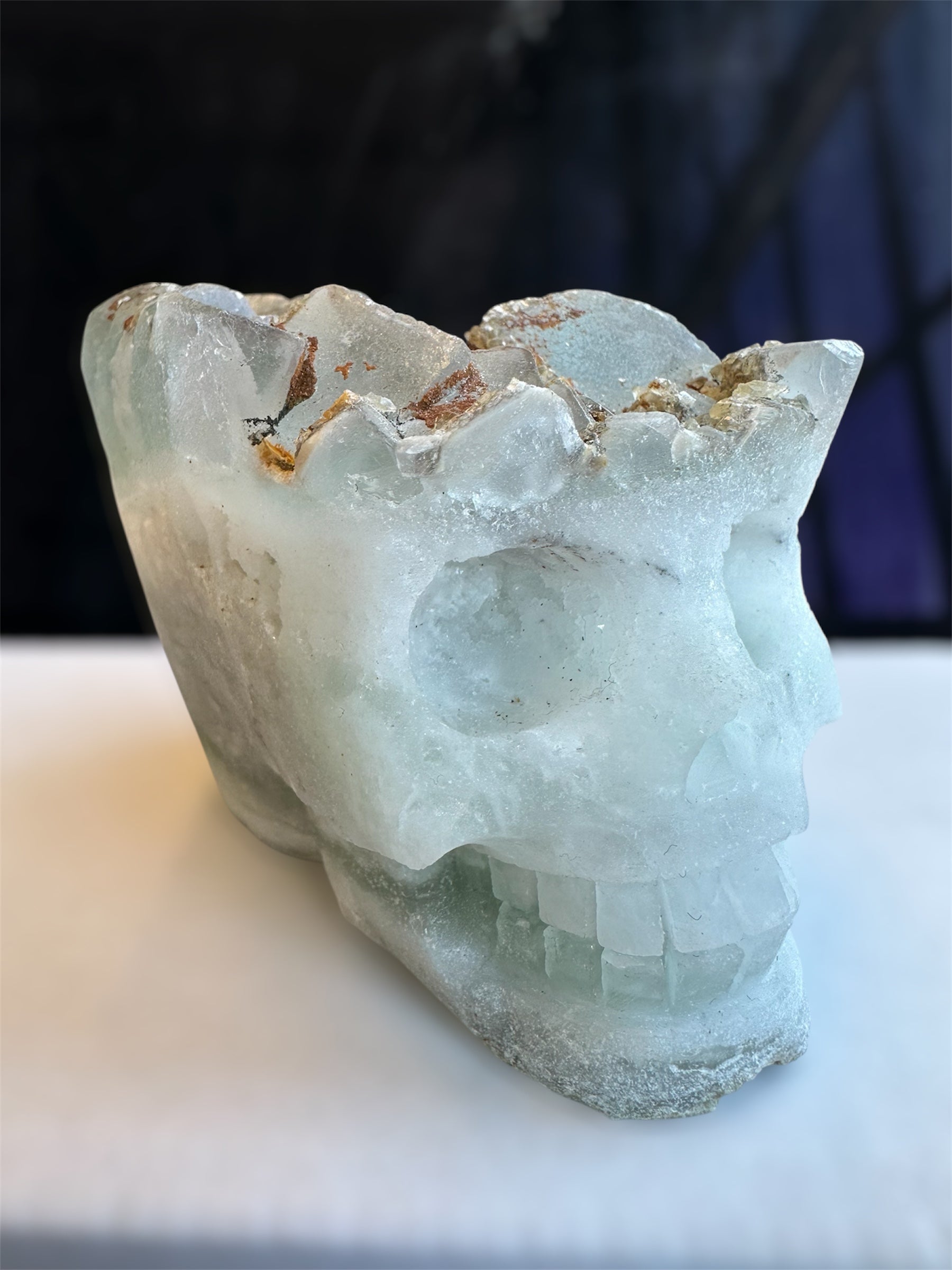 Green fluorite & white quartz carved human skull. The top has been left “raw” so the fluorite cubes look like brains.