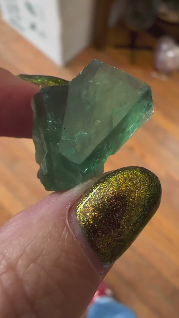 Classic and cute green fluorite twin, showing natural blue daylight-fluorescence from the 50 Year Pocket, Rogerley Mine, Stanhope, County Durham, Weardale, England.
