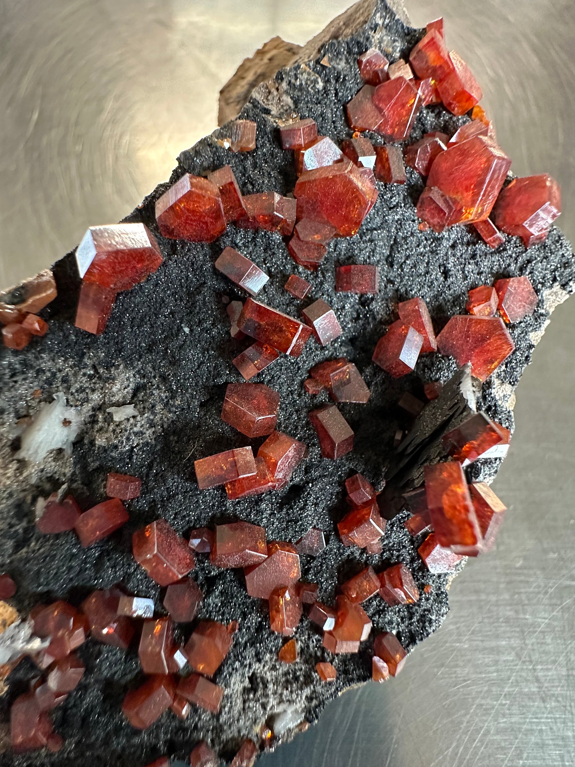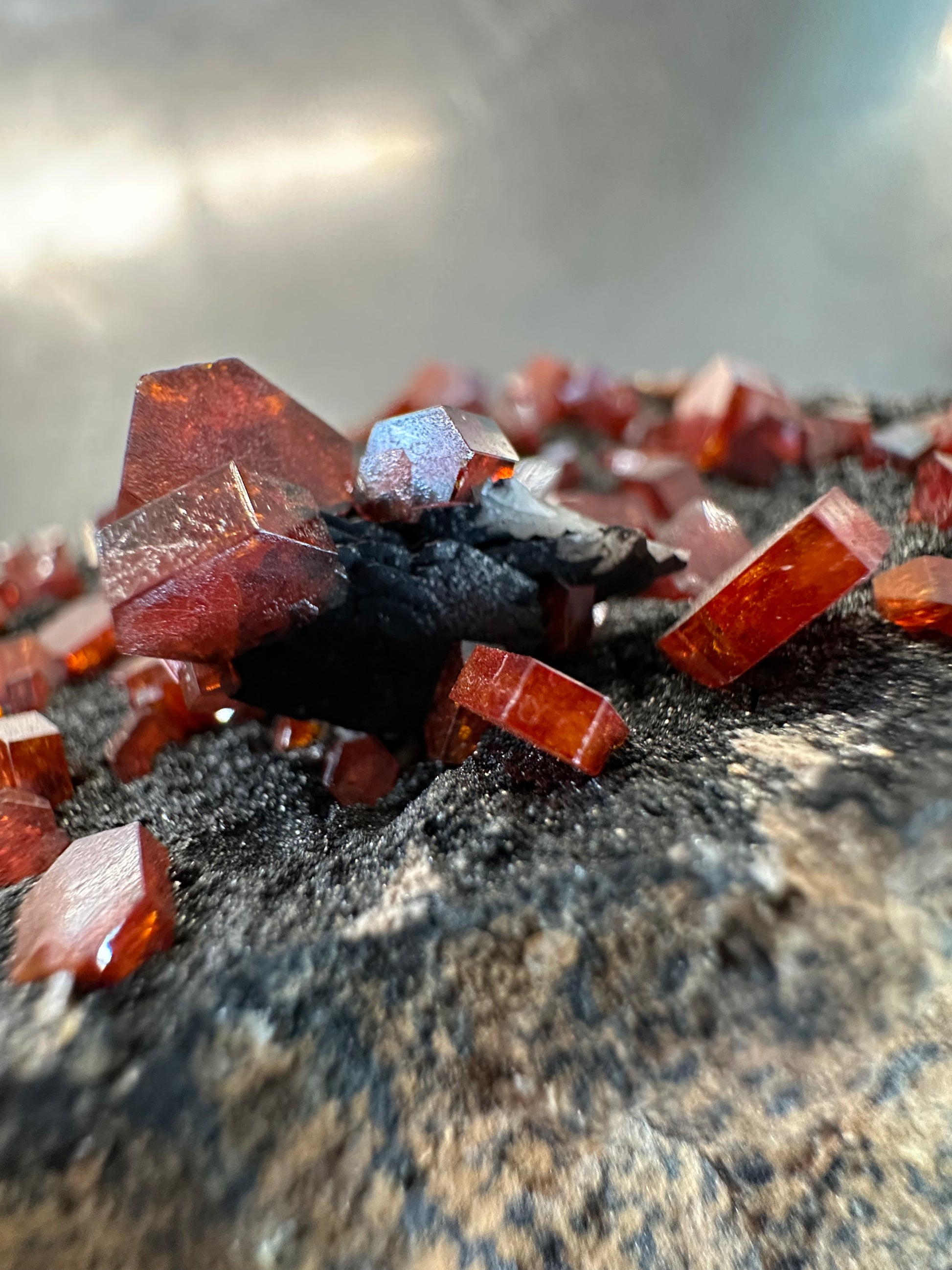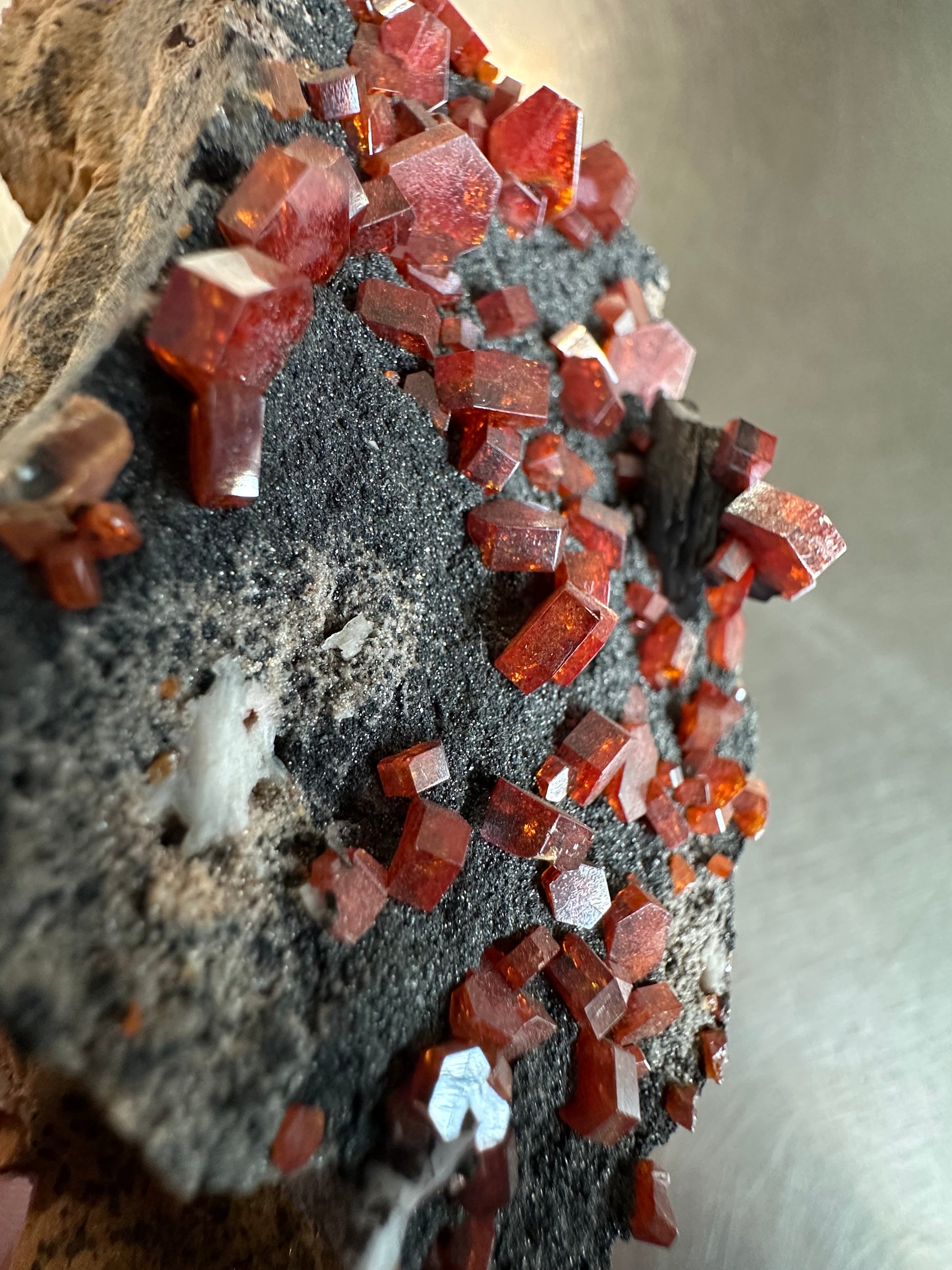 The vanadinite passes light beautifully. These crystals are glowing! The biggest crystal is roughly
