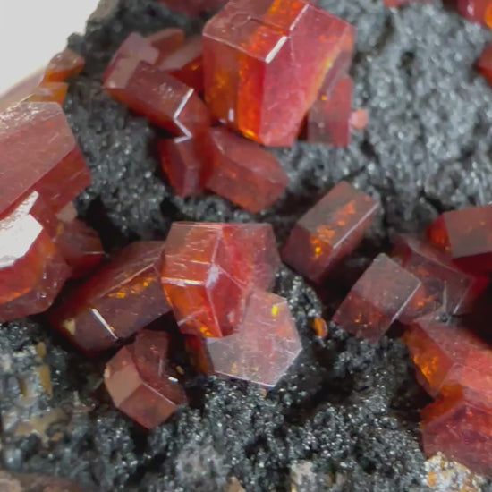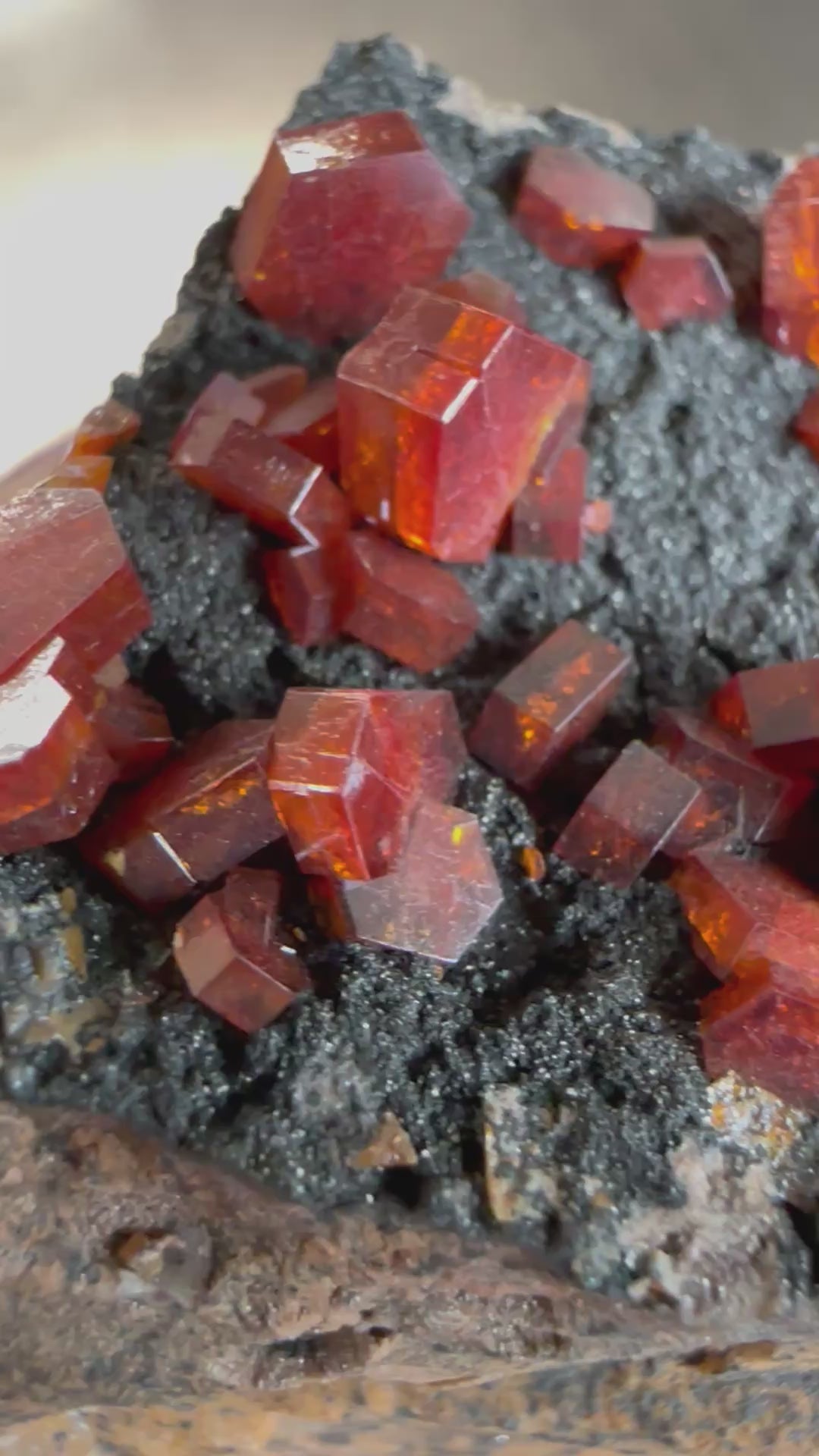 Super gemmy vanadinite crystals against a black goethite-coated matrix from Taouz Caidat, Morocco.