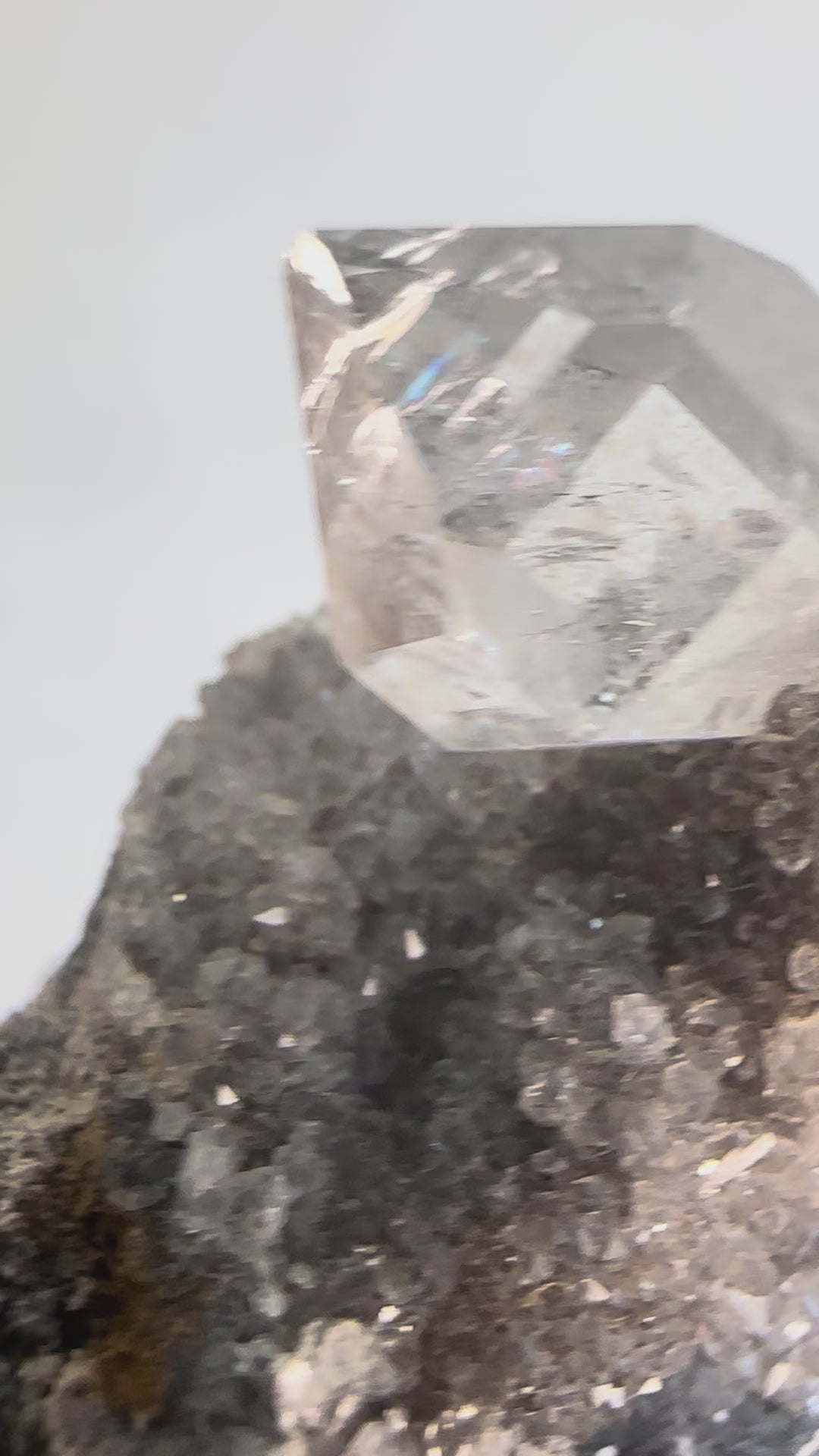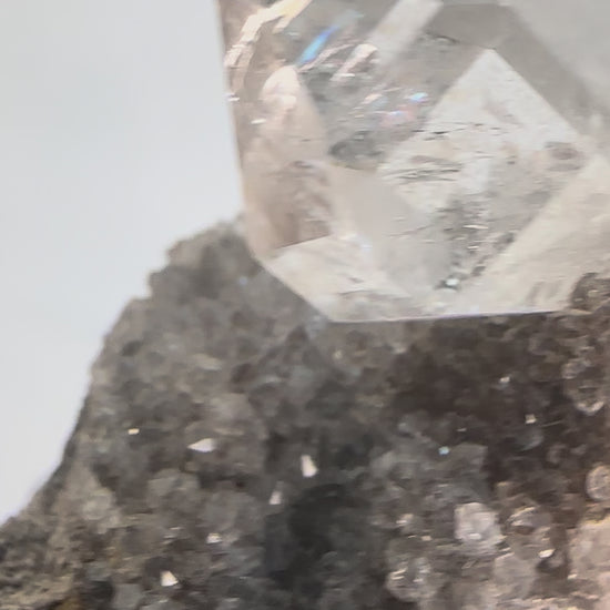 This beautifully terminated quartz sits on a druzy bed of tiny quartz crystals, in the original dolostone matrix.