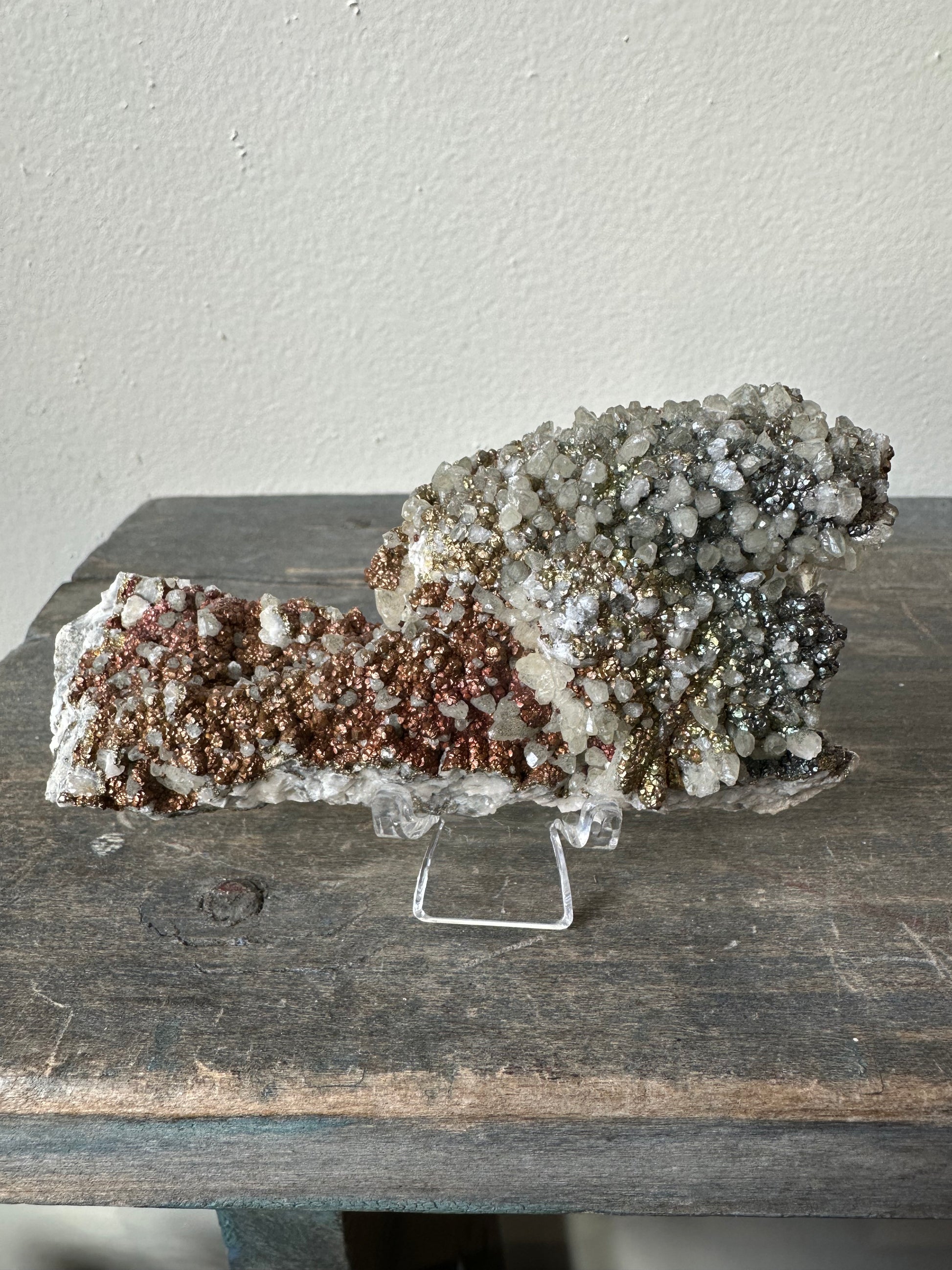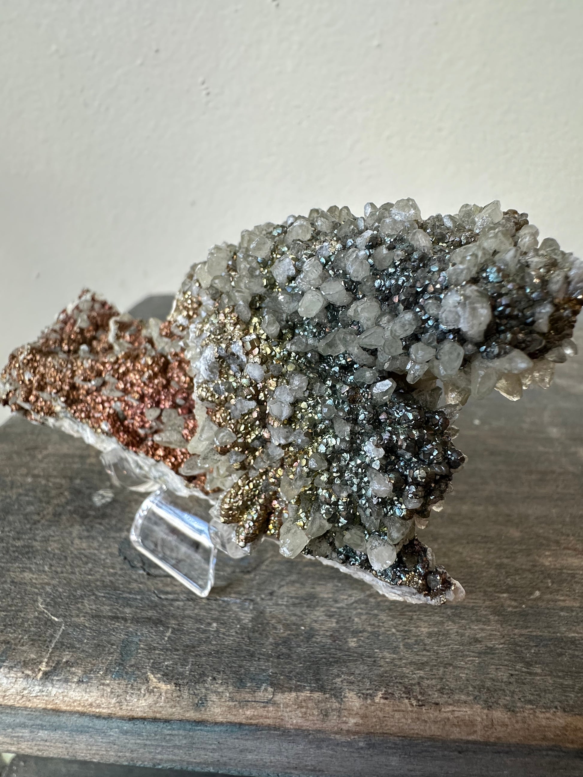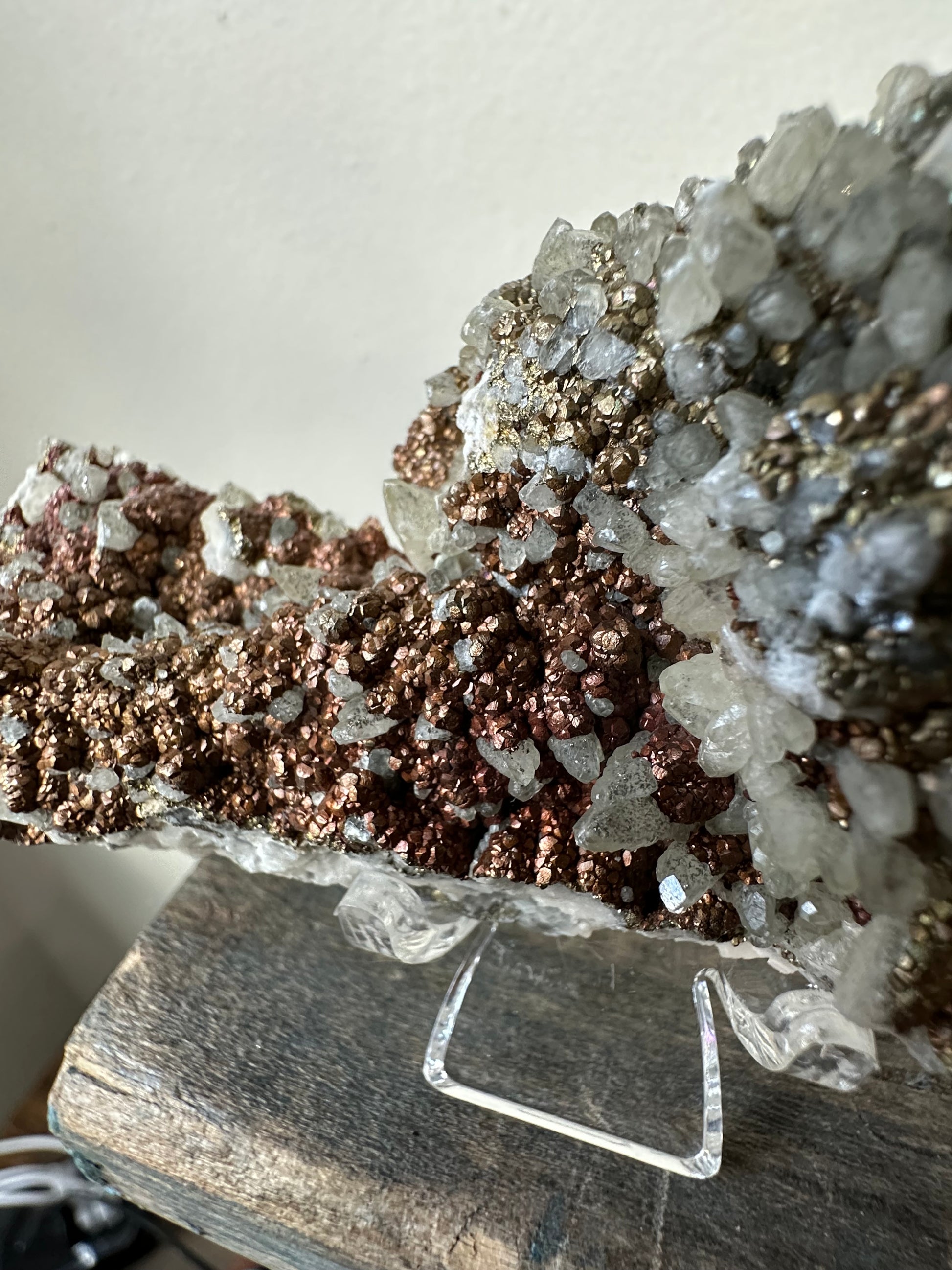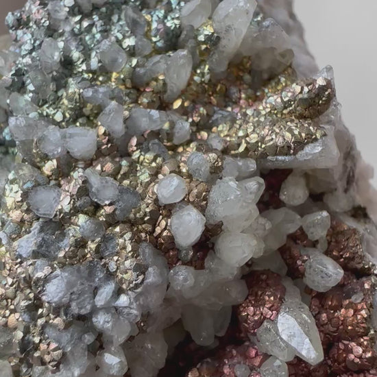 Naturally iridescent chalcopyrite over baby dotooth calcite crystals, on matrix, from Daye Co., Hubei, China.