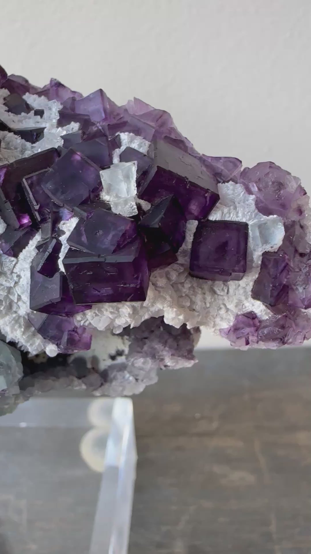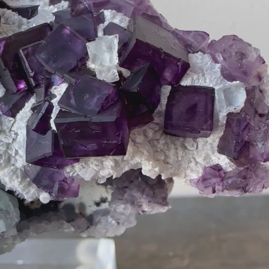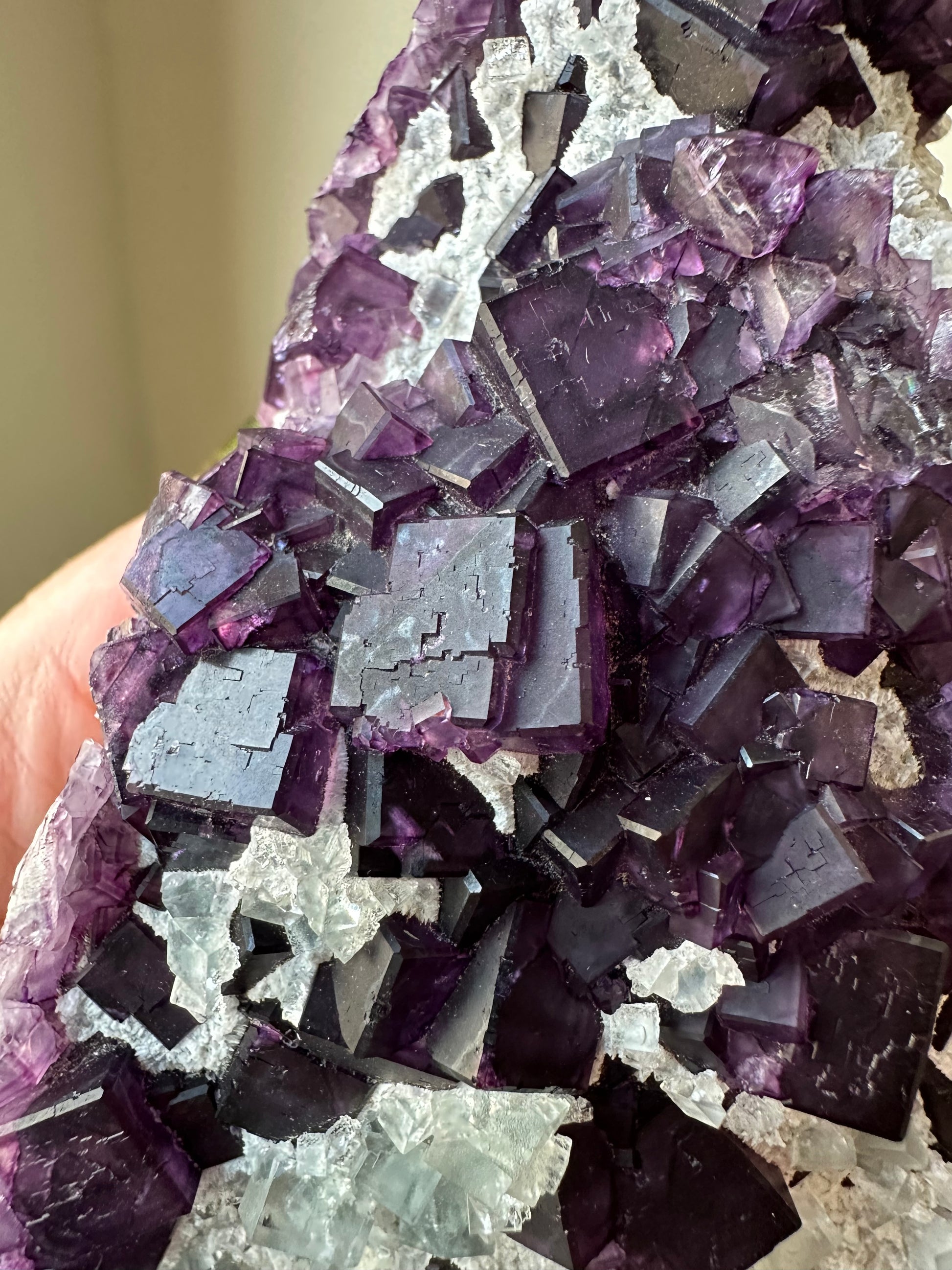 Cubic purple phantom fluorite on a bed of white quartz with baby light blue cubes, from Wuyi Mine, Zhejiang, China.