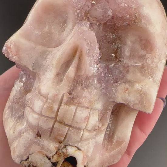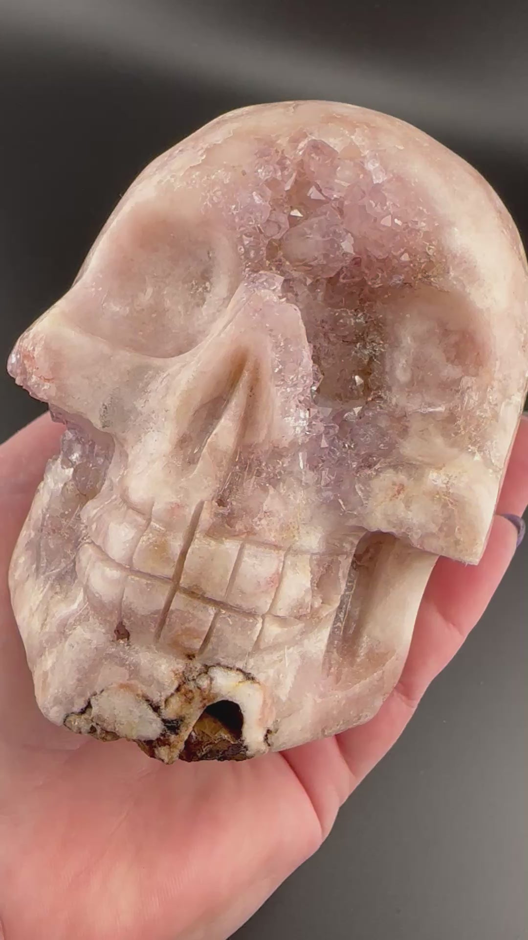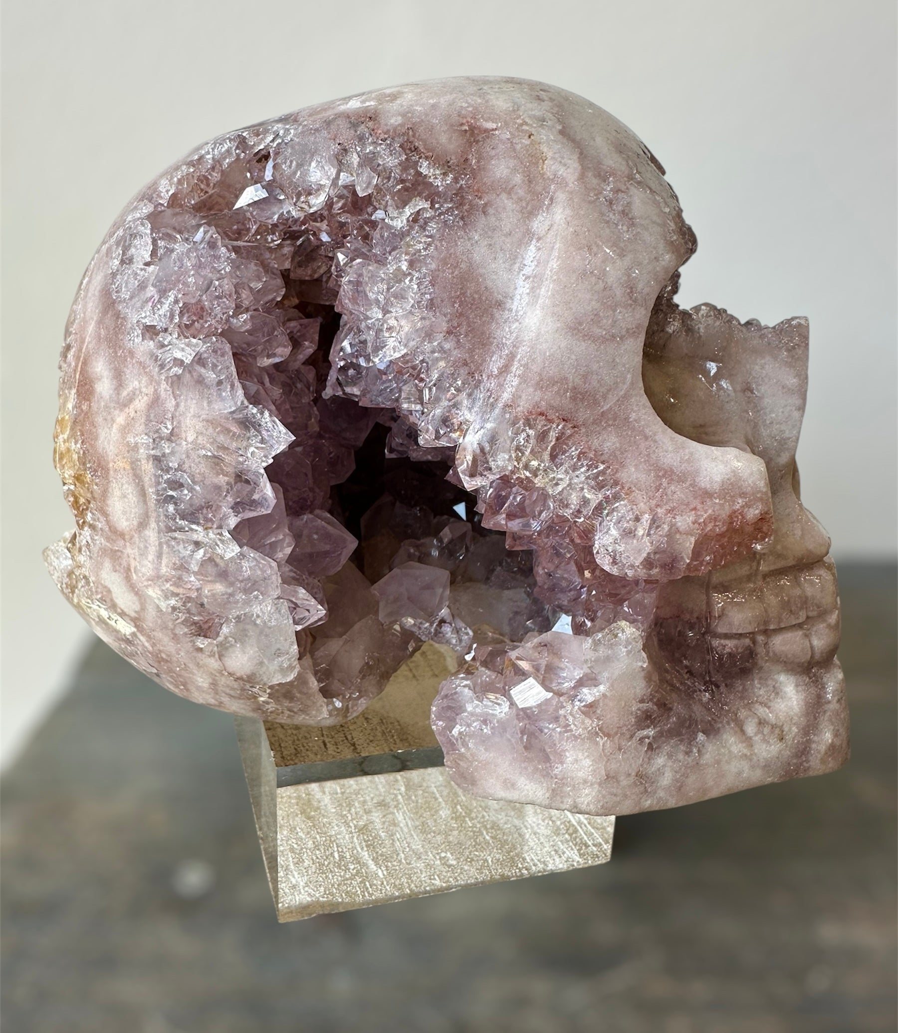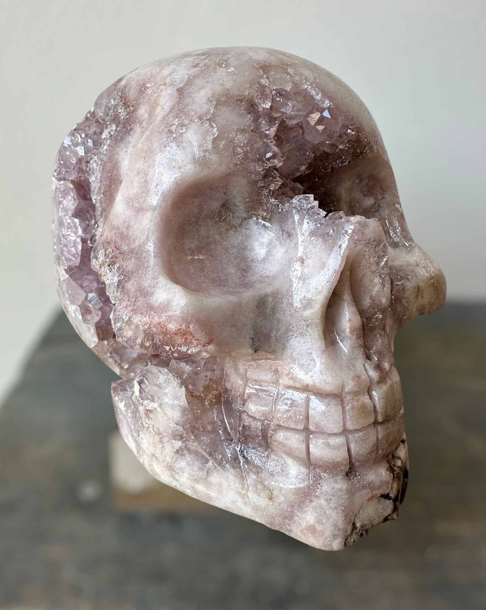 The natural quartz points inside the skull are gorgeous! The surrounding quartz has more of a pibk tint while the points are more amethyst.