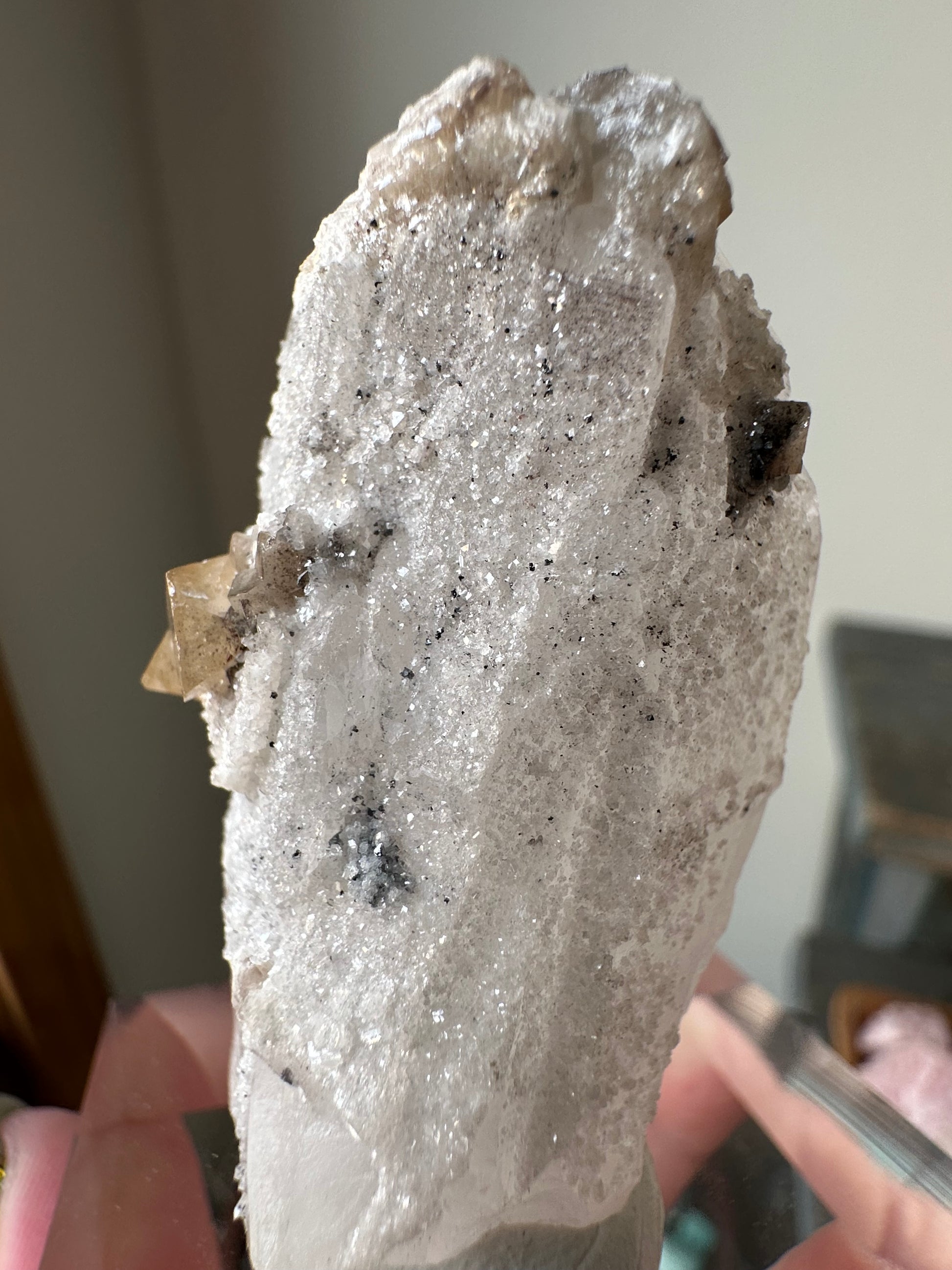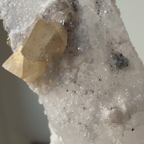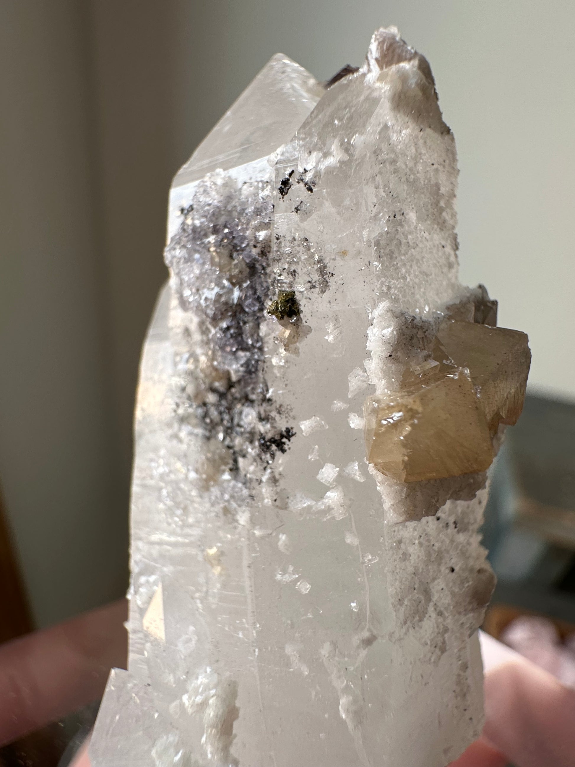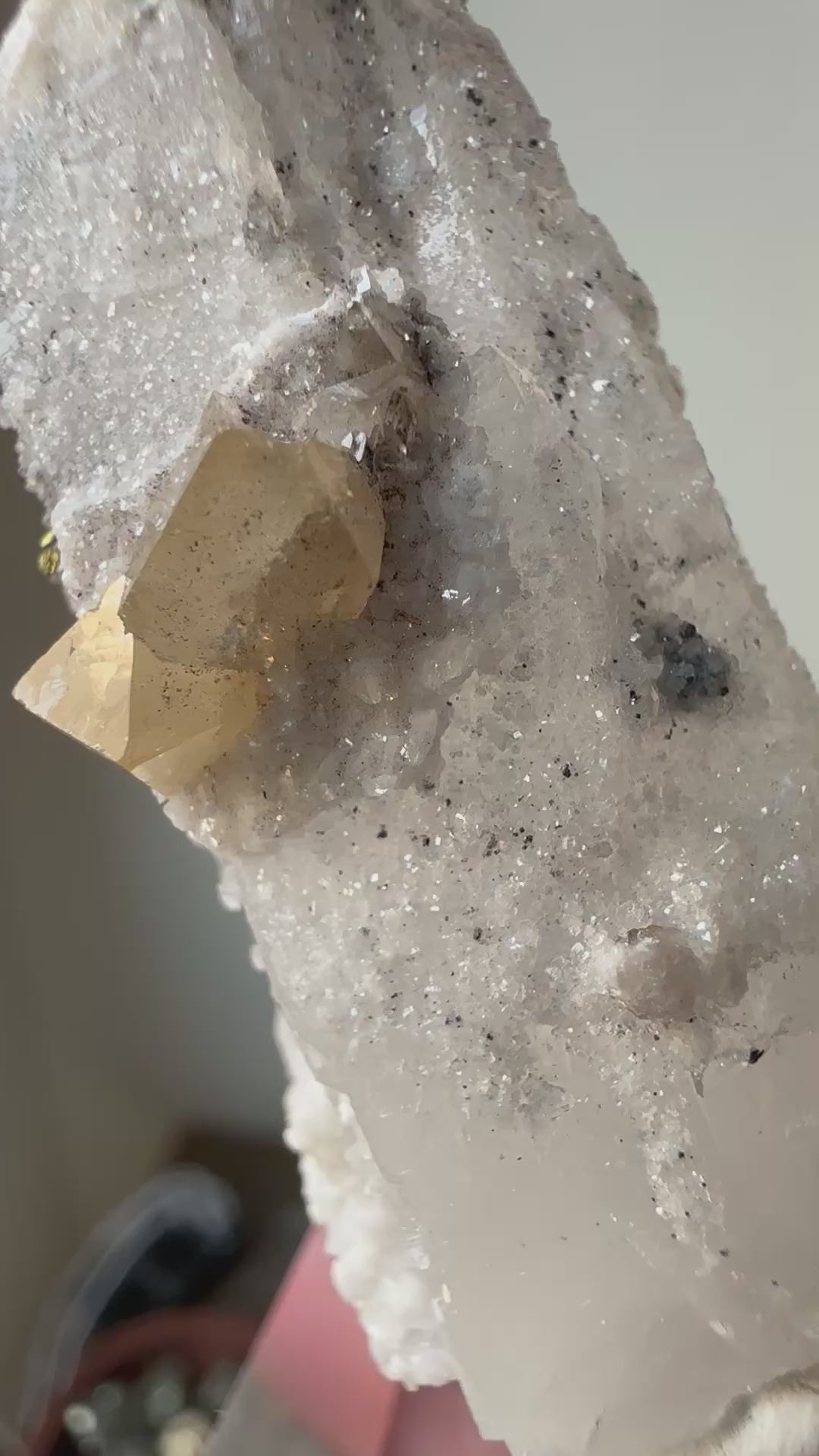 Scheelite on a terminated Quartz crystal with minor pyrite.
