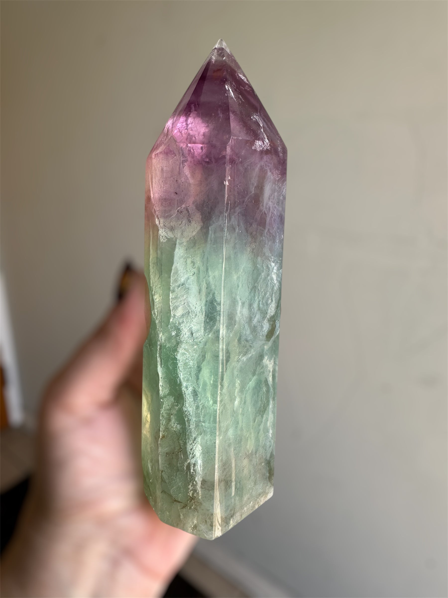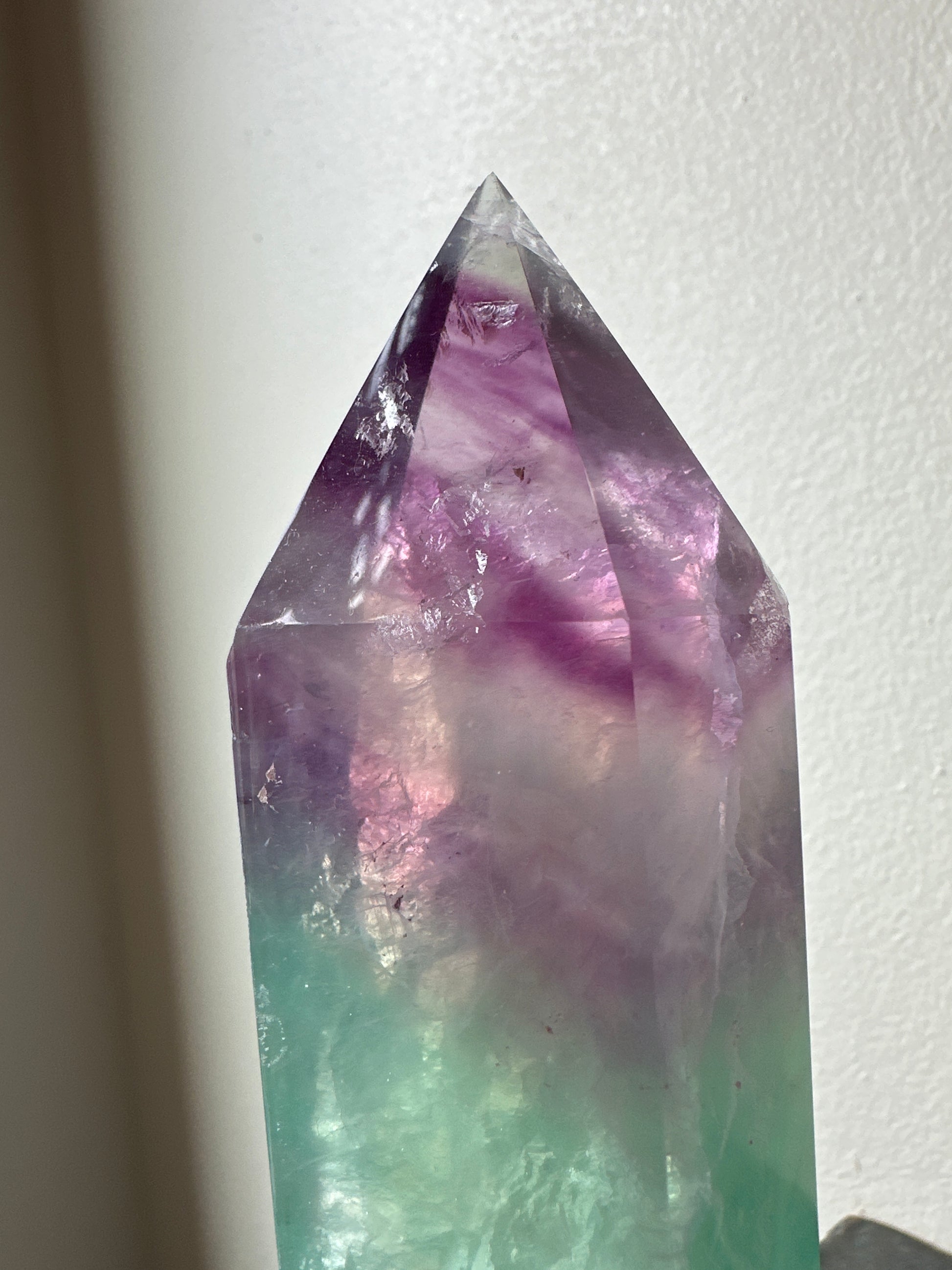 Clear at the tip with purple zoning then hombres from purple to “baja blast” green. What looks like whispy inclusions is actually the ghosted shape of the natural mass of fluorite.