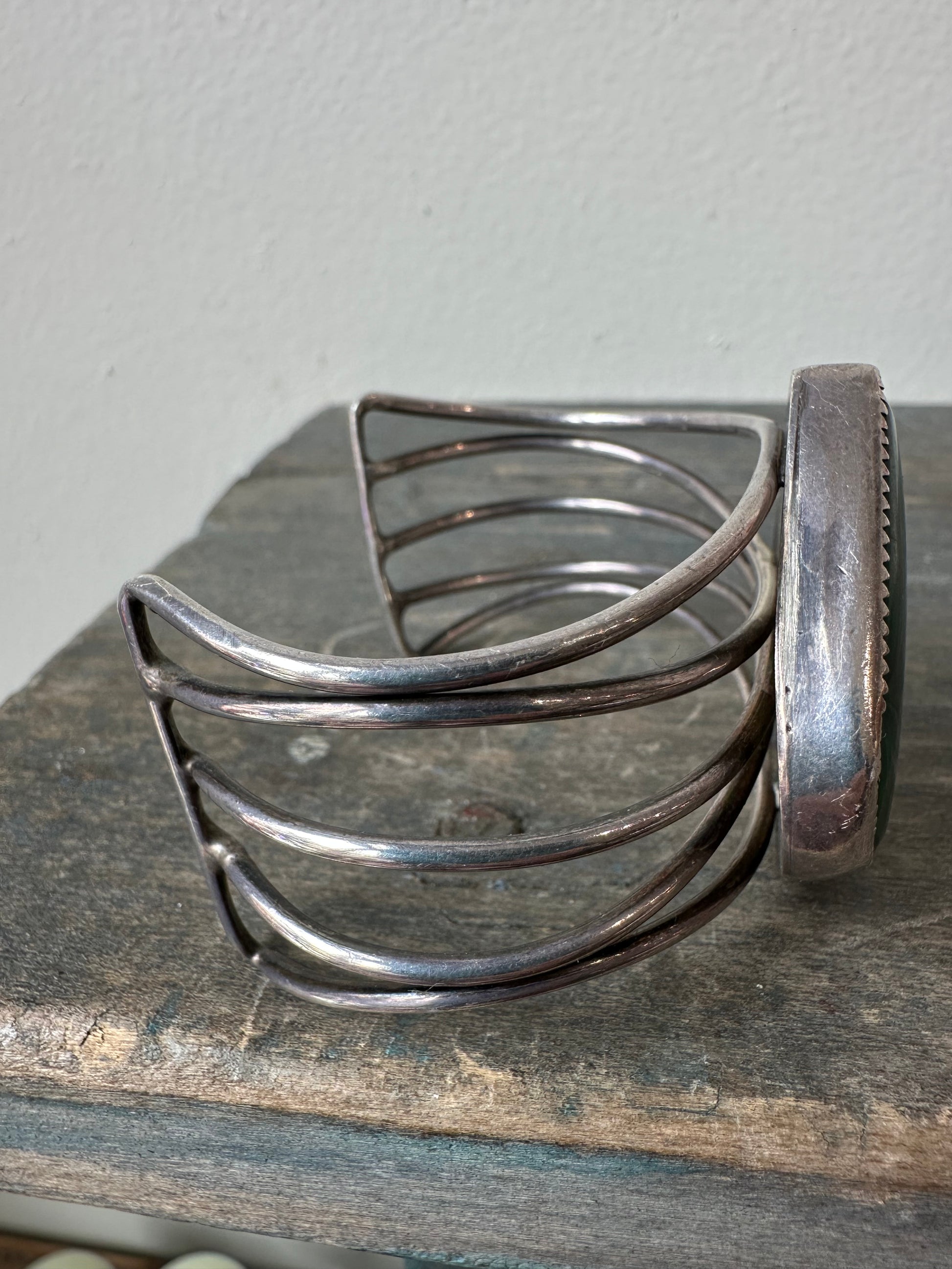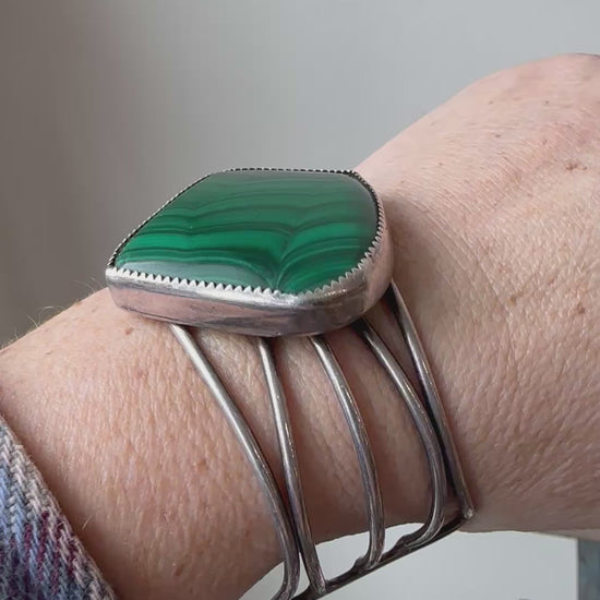 Vintage / antique malachite abstract cabachon set in silver; cuff bracelet.
